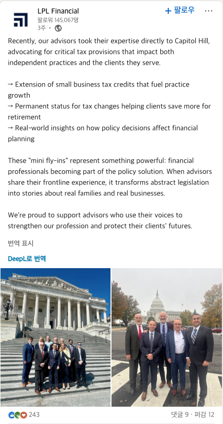 | 안녕하세요 :) 최근에 저희 재무 전문가들이 미국 의회(국회)에 직접 다녀왔어요! 현장에서 느끼는 세무 이슈들을 직접 전달하고, 고객과 독립 재무사들을 위한 제도 개선을 요청드렸습니다. ✔️ 소규모 사업장을 위한 세액공제 연장 ✔️ 은퇴 준비에 도움 되는 세제 혜택 영구화 ✔️ 정책이 실제 재무계획에 어떤 영향을 주는지 생생한 사례 공유 실제 목소리가 정책을 바꾸는 힘이 되더라고요. 앞으로도 고객과 업계를 위해 직접 움직이는 역할 계속해나갈 예정입니다! 💪 이런 느낌 |
