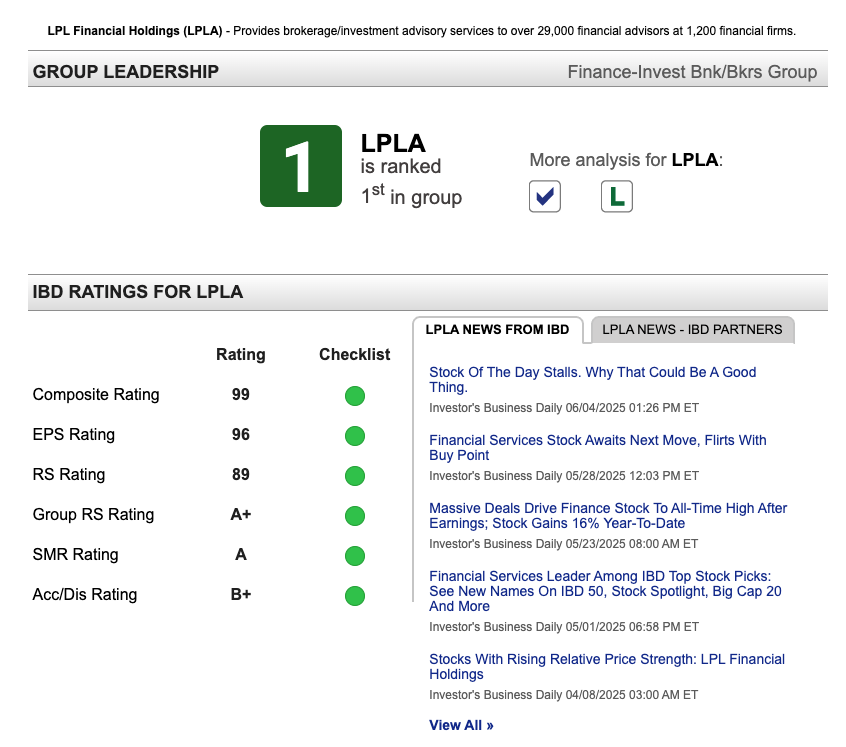 저명한 투자 분석지인 IBD(Investor's Business Daily)에서 LPLA에게 종합 점수 97점(99점 만점)이라는 거의 만점에 가까운 점수를 줬더라고요. 특히 이익 성장률(EPS Rating)은 96점, 재무 건전성을 나타내는 SMR 등급은 A(최고 등급)를 기록했습니다.